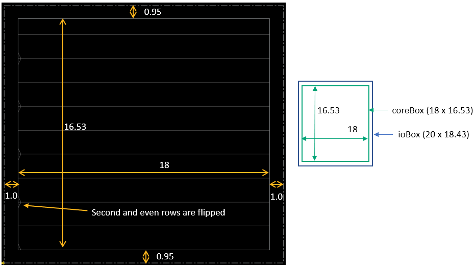 In Innovus, the design boundary or the IO Box is the actual design boundary. In contrast, the core boundary or the Core Box is where core rows are created and standard cells normally placed. Typically, for a digital block that has its floorplan implemented in Innovus, the IO Box and Core Box will be different in size. For example, the following command in Innovus creates a Core Box of width 18 and height 16.53 with a margin of 1 from the left and right edges of the Core Box to the left and right, respectively of the IO Box and a margin of 0.95 from the bottom and top edges of the Core Box to the bottom and top of the IO Box.