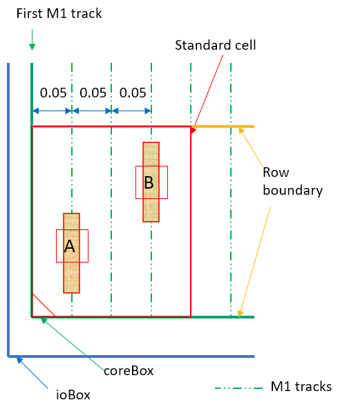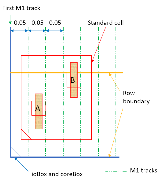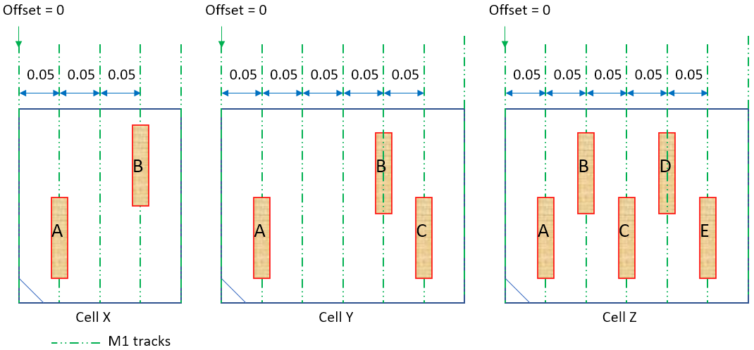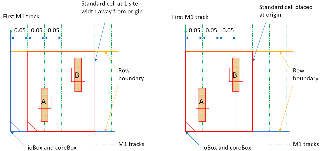 Assume that the standard cell being placed has a site width of 0.05 and the calculated offset and pitch are 0 and 0.05 um, respectively. If the cell is placed in a way that it is aligned with the placement grid (formed by the site width), then the calculated offset and pitch value will result in the tracks being aligned with the I/O pins of the standard cell. The two examples below show standard cells being placed on the grid, resulting in their I/O pins aligning with the tracks.