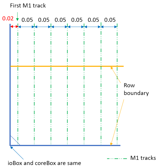 In the following diagram, the routing tracks are created with an offset of 0.02 um and a pitch of 0.05 um. The offset is measured from the left, vertical edge of the coreBox object to the first track. The initial rows and routing tracks are created by Innovus when the cell view is loaded (for example, with init_design).