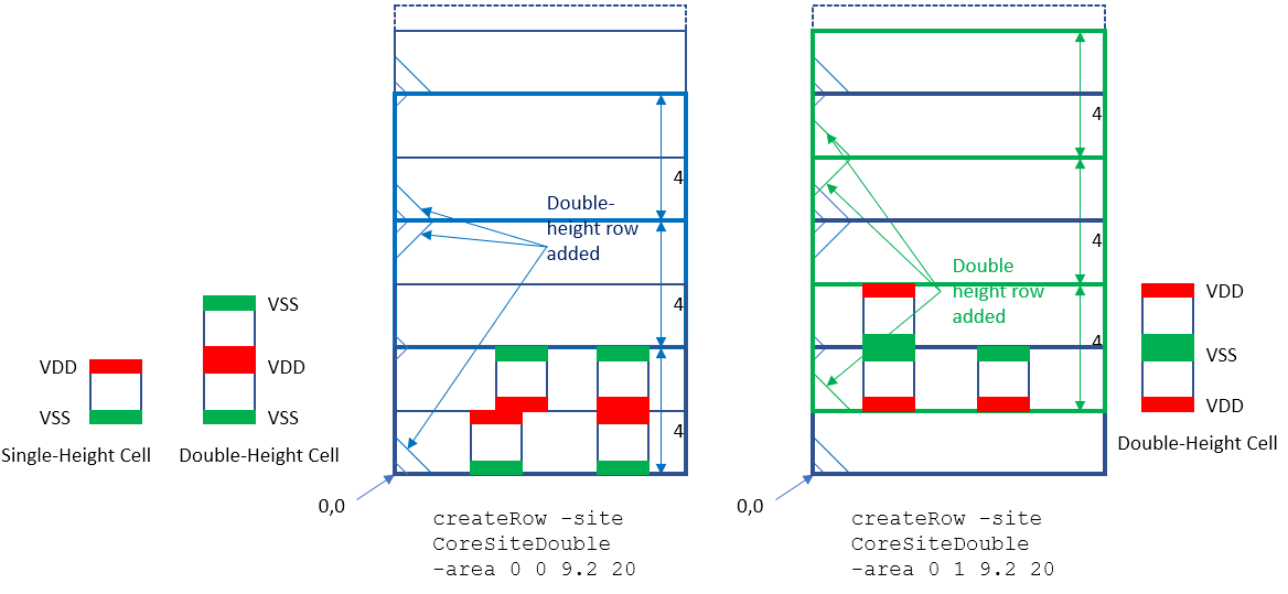If double-height cells with VDD-VSS-VDD combination of P/G pins are used in the design, run the following command to create the corresponding standard cell rows. The first createRow -site CoreSiteDouble -area 0 1 9.2 20y coordinate for the -area option can be any value greater than 0 and less or equal to 2 so that the first double-height row starts from the bottom edge of the second single-height row.