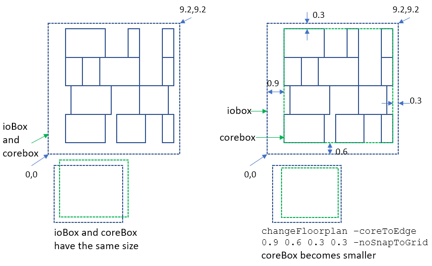 In the above case, a cell view with a PRBoundary object of By running the The The0.03,0 will be off the placement grid.coreBox is not an integral multiple of the row height, the rows created will not fit with all the standard cells, irrespective of the value specified for the -area option. To make the rows fit, use the changeFloorplan command to readjust the coreBox before recreating the rows.9.2x9.2 is loaded into Innovus.changeFloorplan command with the -coreToEdge option in Innovus, the size of the Core Box is adjusted such that the boundary of the Core Box aligns with the boundary of the box that virtually bounds all the standard cells. -coreToEdge option lets you specify the adjustment for the distances between the core box and io box on each side – left, bottom, right, and top. -noSnapToGrid option for changeFloorplan is needed so that the tool will honor the actual value specified in the -coreToEdge option. Without -noSnapToGrid, the tool may make slight adjustments to the specified values so that the Core Box is aligned with the existing tracks. However, as the existing tracks are not likely to be valid and need to be recreated in the next step, the alignment to tracks is not needed.