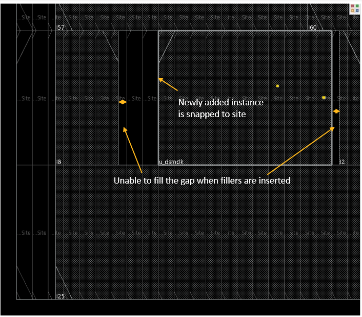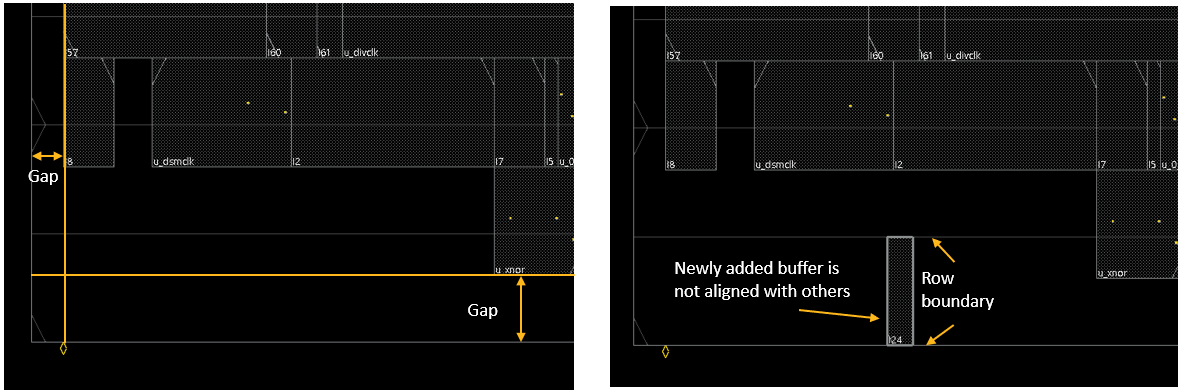In the following case, gaps are present between the left and bottom edges of the standard cells and the design boundary. A new instance inserted by Innovus will not be aligned with other cells in the same row because Innovus will snap the new instance to the row.