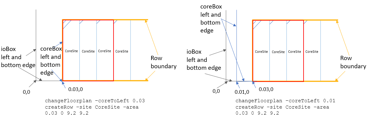 You may have to specify the 0.03,0 will be off the placement grid.coreBox object using the changeFloorplan command. The diagrams below show that an adjustment of either 0.01 or 0.03 to move the left boundary edge of the coreBox will resolve the off-grid issue.-noSnapToGrid option with changeFloorplan so that the tool will honor the actual value specified in the -coreToLeft option.
