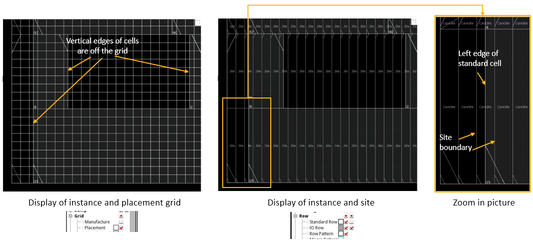 In the case shown below, not only do the manually placed standard cells have a different orientation from the rows created during init_design, there is also a gap between the left edge of the leftmost standard cell and the design boundary. However, having rows created with the correct orientation may not be enough if the cells are not snapping to the placement grid formed by the site width.