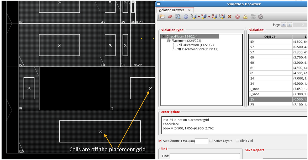 To understand what an Off Placement Grid violation means, select the Visibility check box of the Placement grid or Row Pattern option on the control panel in the main layout window. This will display the placement grid so that you can easily view whether a cell is placed on or off the grid.