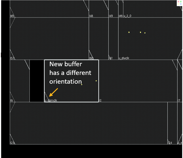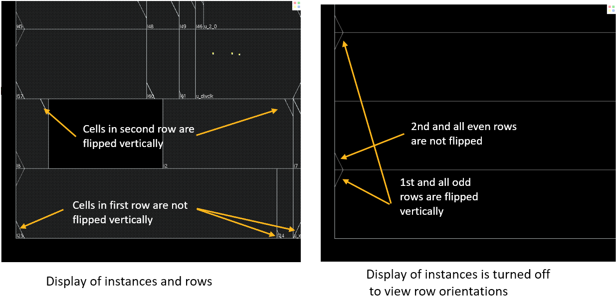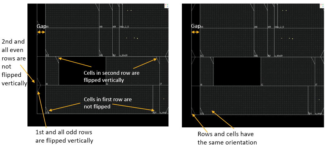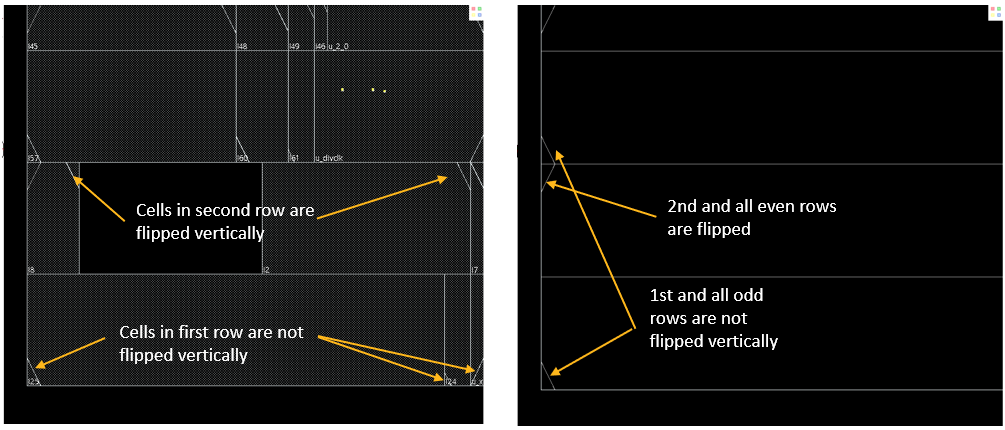 In the above case, the standard cells are manually placed in Virtuoso in a way that the cells of the first and subsequent odd rows are not vertically flipped while those in the second and subsequent even rows are vertically flipped. As by default, the first and other odd rows inserted by Innovus during init_design are vertically flipped, a row versus cell orientation issue arises. If at a later stage, a ECO change needs to be done to insert a buffer, this buffer will have a different orientation from the other cells in the same row.