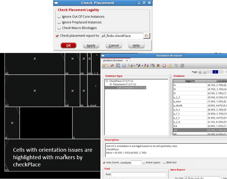 Cell orientation issues can be detected by running the checkPlace command at the Innovus command prompt. Alternatively, you can use the Check Placement form, which can accessed from the Place menu. If routeDesign is run to perform routing, it will also call checkPlace before routing and generate violation markers where applicable.