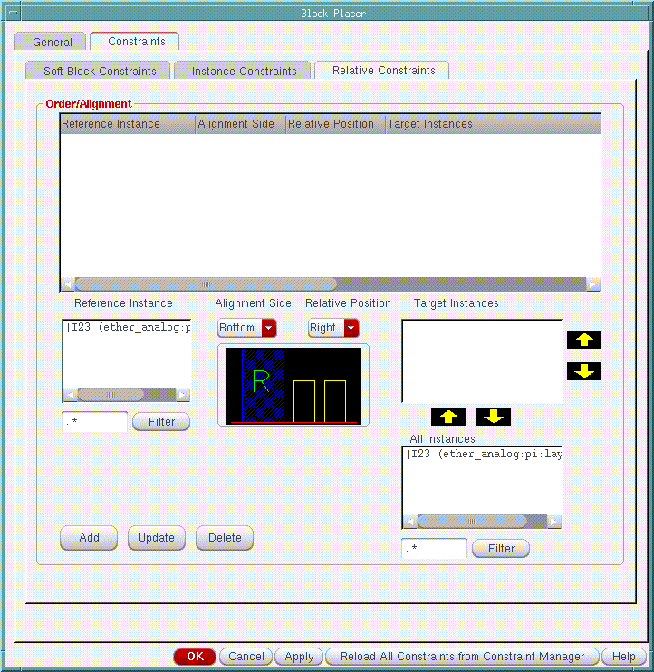- The soft analog block boundary is automatically generated and you can reshape it to match the design constraints. You can run Virtuoso Block Placer to place bigger blocks inside the analog design module. The feature of Block Placer and menu details are shown in the figure below.