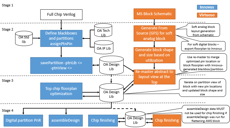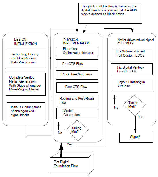 A typical netlist-driven mixed signal flow may look similar to the digital implementation flow with minor differences during floorplanning, top level specialty net routing, and ECO flows.