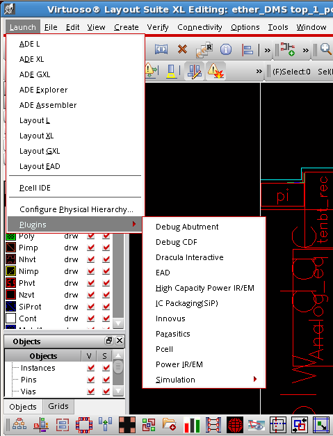 The OA DB Checker is available through the Innovus plug-in in the Virtuoso Launch menu. To launch the OA DB Checker, select Innovus from the Launch --> Plugins submenu in Virtuoso.