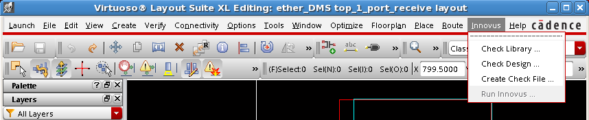 Once the plug-in is invoked, Innovus appears as a menu header on the Virtuoso window.