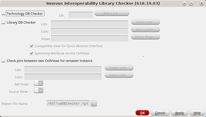 Select the Innovus - Check Library option from the Virtuoso menu bar to open the Innovus Interoperability Library Checker form.