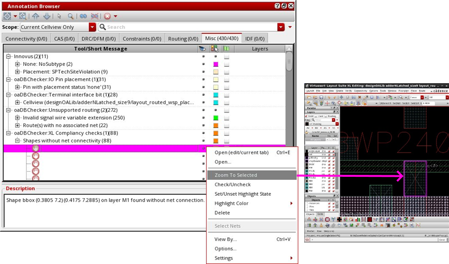 The OA DB Checker logs all violations in the checker log files. However, examining the log file for violations can be time consuming. In this release, the OA DB Checker has been enhanced to create violation markers, which can be displayed using the Annotation Browser window in Virtuoso.