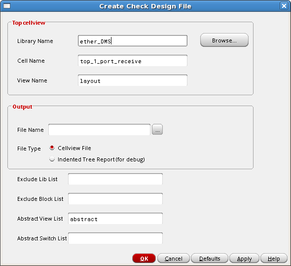 - Create Check File - Opens the Create Check Design File form, which enables you to generate a file containing the lib/cell/views from your design.