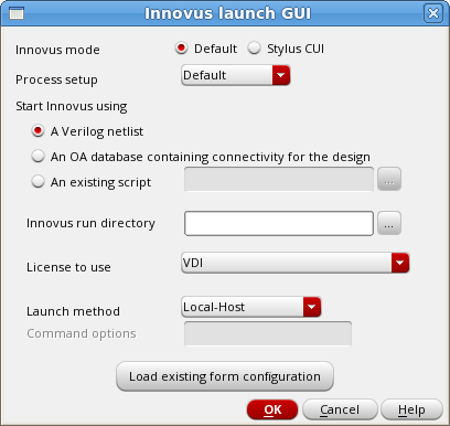 In the Innovus launch GUI form, you choose the mode in which you want to launch Innovus. To learn about these modes, see the Virtuoso Digital Implementation chapter.