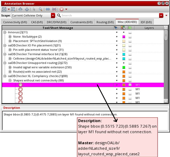 Note: As of this release, all marker violations are reported on the Misc page of the Annotation Browser window. If you ran any DRC check earlier on the current view, the OA DB Checker marker violations appear along with other DRC violations.