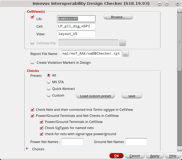 - A single lib/cell/view by specifying the appropriate values in the Lib, Cell, View fields in the CellView(s) section of the checker,