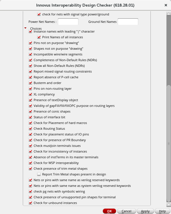 Select the Innovus - Check Design option from the Virtuoso menu bar to open the Innovus Interoperability Design Checker form.