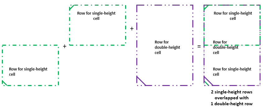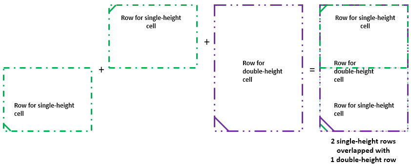 To allow placement of both single- and double-height cells in the same area, both single-height rows and double-height rows are to be created such that they overlay each other. The following diagram shows how rows of different heights and orientations overlay each other.