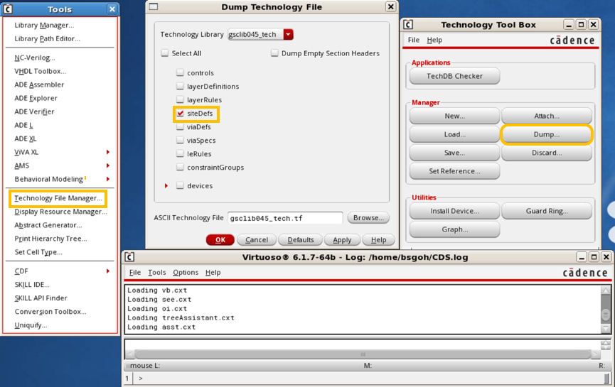 - Select the desired technology library, select the siteDefs check box, specify the file name in the ASCII Technology File text box and click OK.