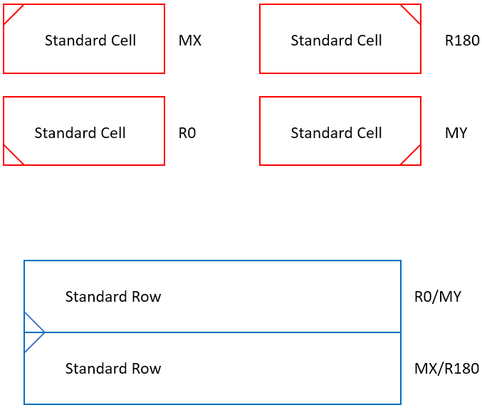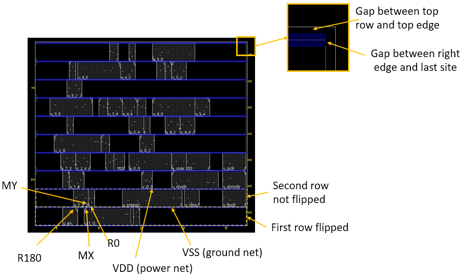 Innovus inserts the rows from the bottom to the top, with sites added from left to right. The bottom row is the first row added, and is flipped by default so that it can share the same power rail with the next row, which is not flipped. This implies that single-height standard cells with XY symmetry are placed either with the MX or R180 orientation in the first row. Similarly, for the other odd rows. All the even rows are not flipped, and therefore single-height standard cells in those rows are placed with either R0 or MY orientation.