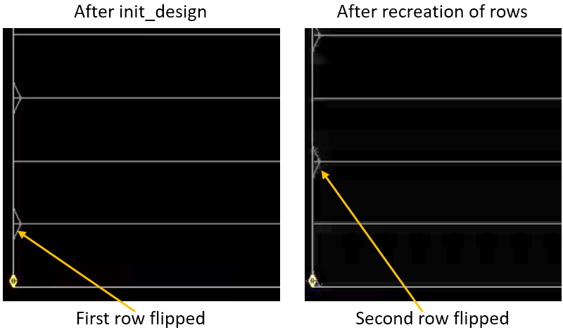 As the bottom row (and other odd number rows) created by init_design is flipped by default, these rows are unusable if the standard cells are to be placed with a different orientation. To recreate rows with a different orientation, follow the steps below: