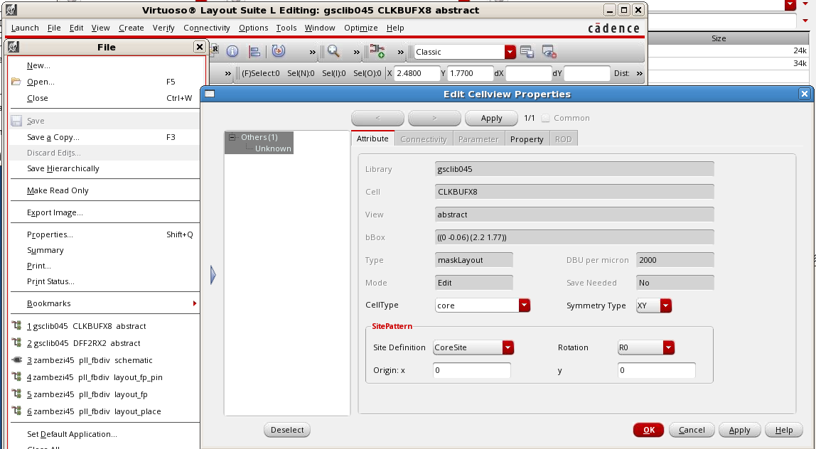 Site definition is a property that should be defined in the abstract of the standard cells. To view the site definition of a cell view, open it in Virtuoso and select File -> Properties from the menu bar. This displays the Edit Cellview Properties form. The following example shows the properties of the CLKBUFX8 standard cell. Its site name is CoreSite. Its Symmetry Type of XY indicates that it can also be placed with different orientations of R0, MX, MY, and R180. Note that this cell is of cellType core, which enables Innovus to identify it as a standard cell.