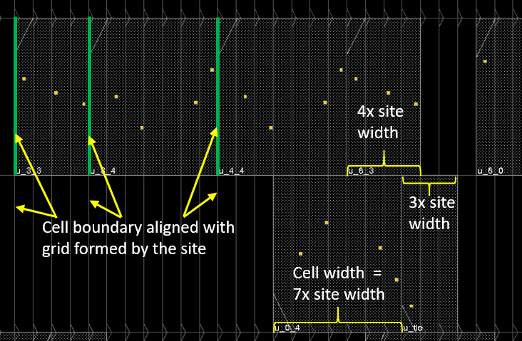 Site and row are basic terms related to placement and routing. A site defines a placement site, and is a placement location that can be used by the cells that match the same site. Physically, it is a rectangle with a specific width and height. A repeating set of sites creates a row.