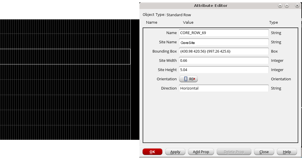 After selecting a standard cell row, double-click or press the Q key to view the Site Name, Site Width and Site Height, and other attributes of the row.