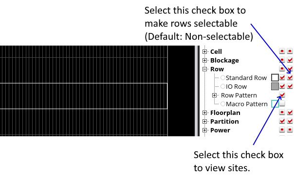 In Innovus, the standard cell rows in the design are not selectable by default. To make them selectable, check the Selectability check box for Standard Row in the Control Panel, which is located at the right of the main window. Similarly, the sites are not visible by default so you need to select the Visibility check box for Row Pattern to view the sites.