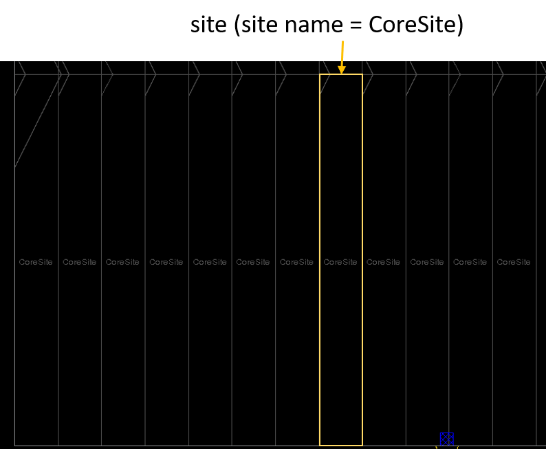 A site can either be an I/O pad site for the placement of I/O pads or a core site for the placement of standard cells. The above and below pictures show how the repeating sites form a horizontal standard cell row. Sites for standard cells are called core sites because the standard cells are placed in the core area of the design.