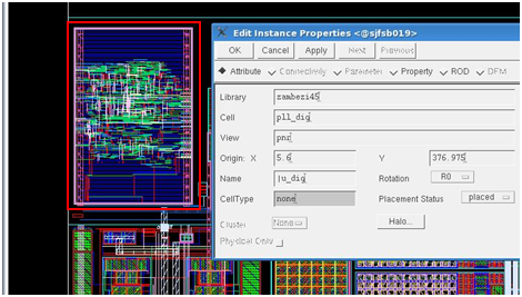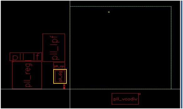 From where is the tech information read? If an OpenAccess design is read, the tech graph is analyzed from the design_lib that contains the cellview. If a Verilog netlist is read with OpenAccess reference libraries, then the first library in the OpenAccess ref lib list is used for the tech. This means that the order of the ref libs is important when a Verilog netlist is used. Note: Additionally, sites and vias can be read from other libraries even though they are mostly considered to be tech information. Select Power - Connect Global Nets from the Innovus menu bar to open the Global Net Connections form where you can check the power and ground connections for the block. The design appears as follows after OpenAccess load. Type the following command at the Innovus shell to start placement: The design appears as follows after placement and routing.set init_verilog pll_dig.vgset init_top_cell pll_digset init_oa_ref_lib {gsclib045 gpdk045 giolib045}set init_pwr_net {VDD}set init_gnd_net {VSS}init_designwin