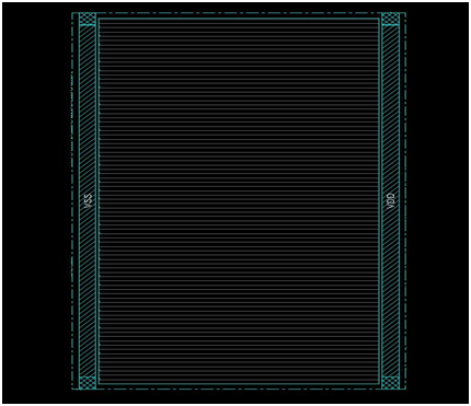The design appears as follows after initialization. oaIn zambezi45 pll_dig layout_pushedchangeFloorplan -coreToEdge {8 2 8 2}read_power_intent -cpf pll_dig.cpfcommit_power_intentplace_designdbDeleteTrialRoutesroute -connect { corePin } -nets { VDD VSS }generateViasrouteDesignverifyConnectivity -noAntennaThere should be no errors after verifyConnectivity. The -noAntenna option allows for the dangling wires at the end of the rows.saveDesign command. Specify a new view name, such as pnr, while saving the designsaveDesign -cellview {zambezi45 pll_dig pnr}