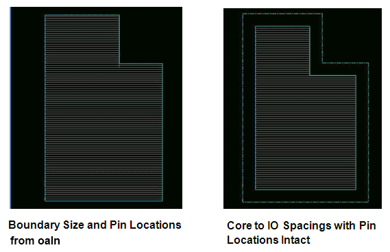 Note: Do not use the Specify Floorplan command because it is not an incremental command and will reset the boundary shape to rectangular in case the prBoundary is rectilinear. It will also reinitialize the pin and pad placements. Instead, use the following command to update the IO to core spacing: