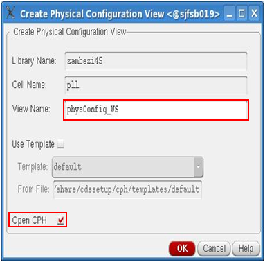 layout_WS, in the View text box and click OK. - In the Create Physical Configuration View form that is displayed next, specify a name for the configuration view in the View Name text box and select the Open CPH check box to open the Configure Physical Hierarchy form in which you will configure the top-level floorplan. Click OK when done.