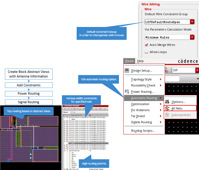 This part of the flow takes advantage of the enhanced interoperability between the Virtuoso and Innovus platforms, and is made possible through the use of the OpenAccess database. Most of these tasks are typically executed by the digital designer. However, the goal is to ensure that the analog (Virtuoso) and digital (Innovus) designers are working from the same database at all times in order to maximize collaboration and reduce the chances of miscommunication. This flow has other advantages such as cross-platform ECOs, design-constraint interoperability, and a host of other advantages for the design teams.
