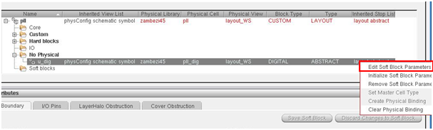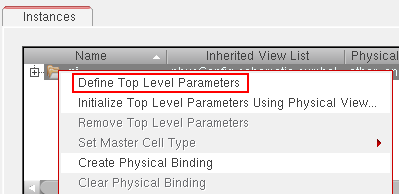 CustomtoDigital. This changes the snap grid for the pins and boundary to the place & route grid instead of the manufacturing grid. In addition, set Type asAbstract. - Right-click the top-level cell and select Define Top Level Parameters from the context menu.