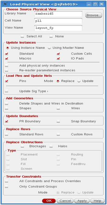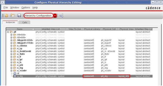 physConfig). This identifies the mapping between schematic components and layout components. It is possible for the layout views to be located in other libraries. For blocks for which user does not have a layout view, theprBoundarycan be entered using an estimate for the layout area and the pin information could be entered using the information found on the schematic symbol.