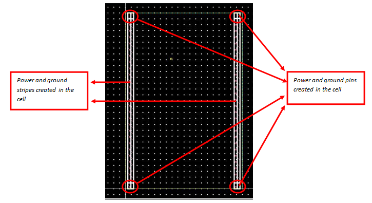 Select the power and ground stripes and check that the net name is nowVDDandVSSfor the pushed shapes. You can also view the pinsVDDandVSScreated at both the ends for the stripes that have been pushed down.