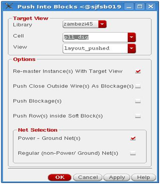This opens the Push Into Blocks form. - The library and cell view details are filled by default in the Push Into Blocks form based on the selected block. Click OK to push the power shapes into the new