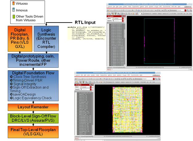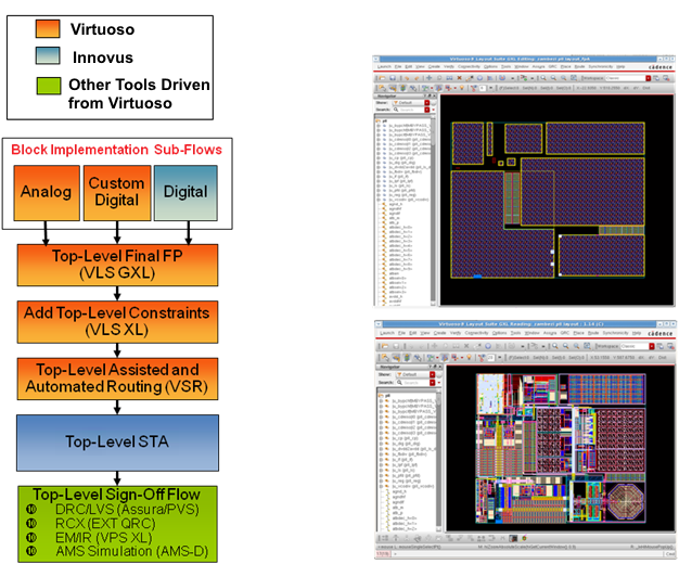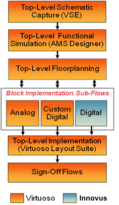 Ideally, the schematic capture will begin in a top-down fashion with a top-level schematic. It is this top level connectivity source that makes it possible to do early floorplanning within the Virtuoso layout environment, and differentiates this schematic-on-top implementation from the netlist-driven or netlist-driven mixed signal approach. Schematic-on-top does not mean that the schematic must exist for all the blocks in the design throughout the entire hierarchy. It only refers to the top-level. In addition, the schematics will be used to drive the implementation of any analog portions of the design. However, netlists will and should be used for most of the digital-design content.