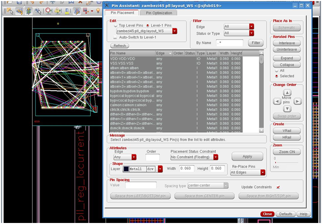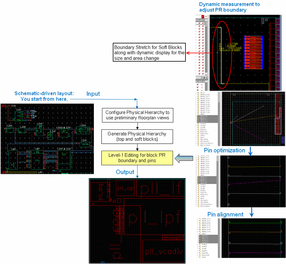 - Placing and arranging all the blocks - adjusting their location and shape. Adjust pin locations and sizes - taking advantage of the various pin alignment and optimization features available in the Virtuoso Floorplanner. You can also edit the block shape by using level-1 editing commands, which allow you to modify the block prBoundary from the top level.