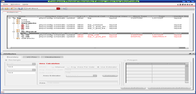 In the schematic-driven mixed signal flow, most of the floorplanning, in particular the top-level floorplanning is done in the Virtuoso environment, using the top down floorplanning methodology. In this flow, some or all of the sub-blocks will be created as soft blocks, as they have not been fully implemented yet.
