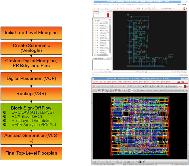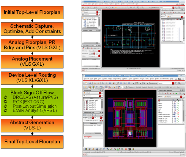 Block-level sign-off is an entire sub flow within itself and consists of the steps necessary to make sure the design is logically correct, can be manufactured, and still meets its performance requirements. This flow is fairly standard and highly dependent both on the design-specific challenges and the foundry requirements. Refer to the Virtuoso documentation for more details on this sub-flow.