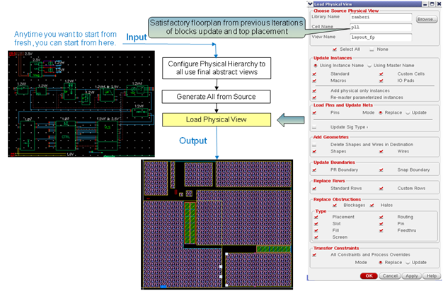 The above figures show how CPH works after launching Virtuoso Layout Editor-XL for a top-level schematic for the first time. CPH gives you control over the automated schematic-to-layout generation process without requiring the layout designer to modify the schematic.