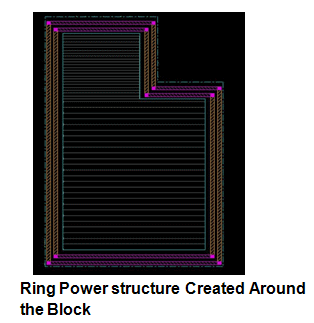After the floorplan for the block has been fixed, the power routing for the block can be performed. The space between the IO and the core region created can be used to create a power ring structure or you might choose to create stripes or custom power topology as per the design specifications.