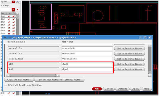 - Propagate the power and ground nets on the digital cell instTerms as per the top-level nets. The top-level net is connected with the instTerms so that the push command can identify which net to create at the lower level for the top-level power or ground nets.