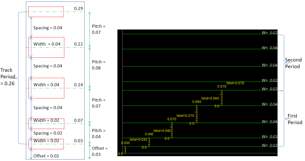 The add_tracks command also allows you to specify routing tracks with width and pitch pattern. Consider a WSP for M3 with the offset value, wire widths and spacing requirements between wires as shown in the following diagram. The equivalent command in Innovus is: