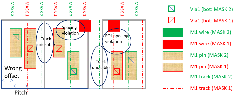 The incorrect offset specification may similarly make certain segments of tracks unusable for routing and may restrict the router’s solution space to only via insertion for pin access. It may create a spacing and End-of-Line (EOL) spacing violations between geometries of the same mask number.