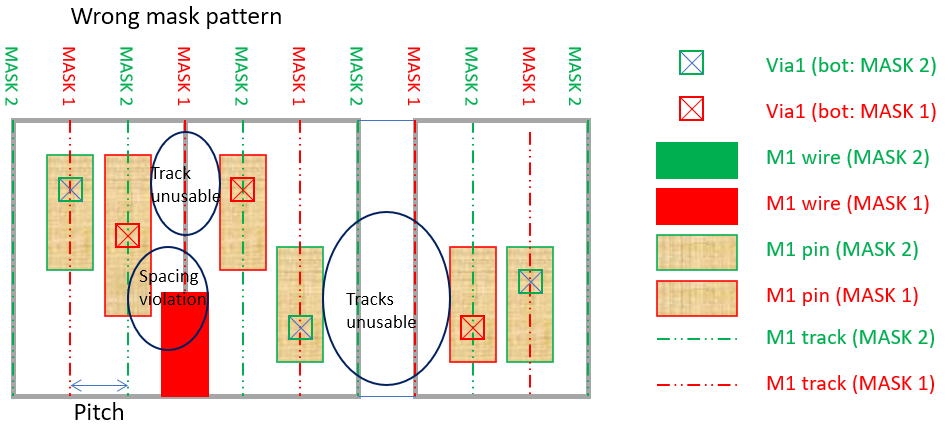 Most likely, the incorrect mask pattern specification would result in the router being unable to add wires to make connection with the pin and would restrict the router’s solution space to just via insertion for pin access. If the design rule requires the geometries of the same mask to be centered two track distance apart, it could also cause a spacing violation between the M1 pin and the M1 wire of the same mask number and make the track segments close to the pins unusable for routing.